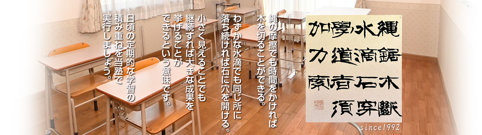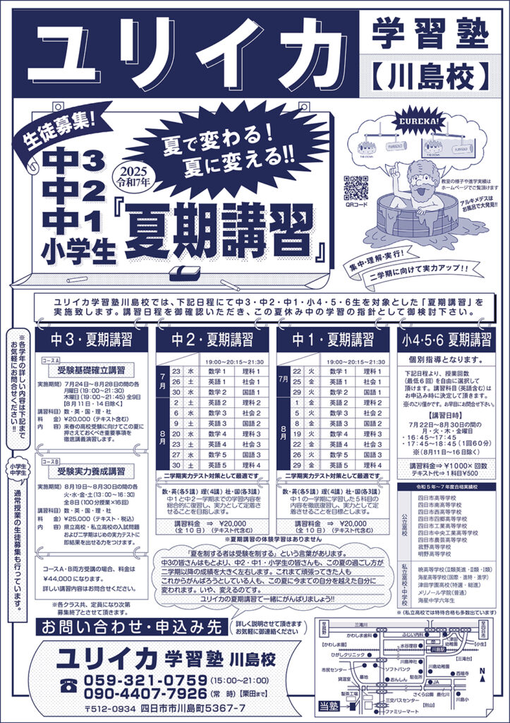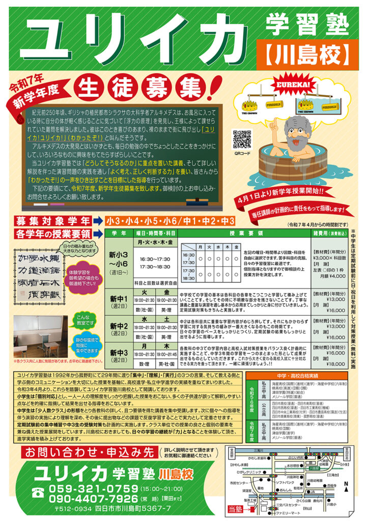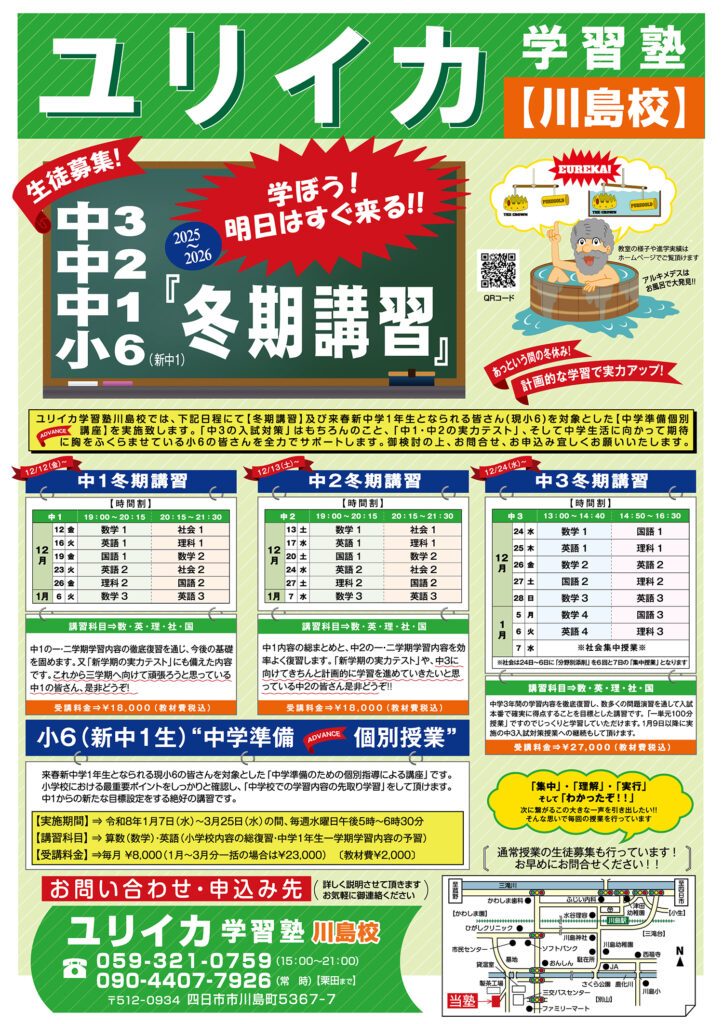 この度はユリイカ学習塾のホームページをご訪問下さりありがとうございます!1992年の菰野校開講以来30年に渡り「集中」「理解」「実行」の3つの言葉を柱として、ていねいでわかりやすい授業を通して、定期試験および中学、高校入試の実績を重ねてきています。この度、これらを踏襲し、令和3年4月よりユリイカ学習塾川島校として開講しております。今後も学習塾として、やるべきことを誠実に行ってまいります。お問合せお申し込みよろしくお願いいたします。
